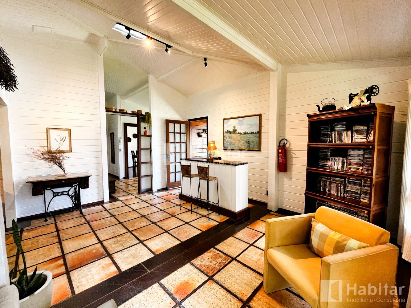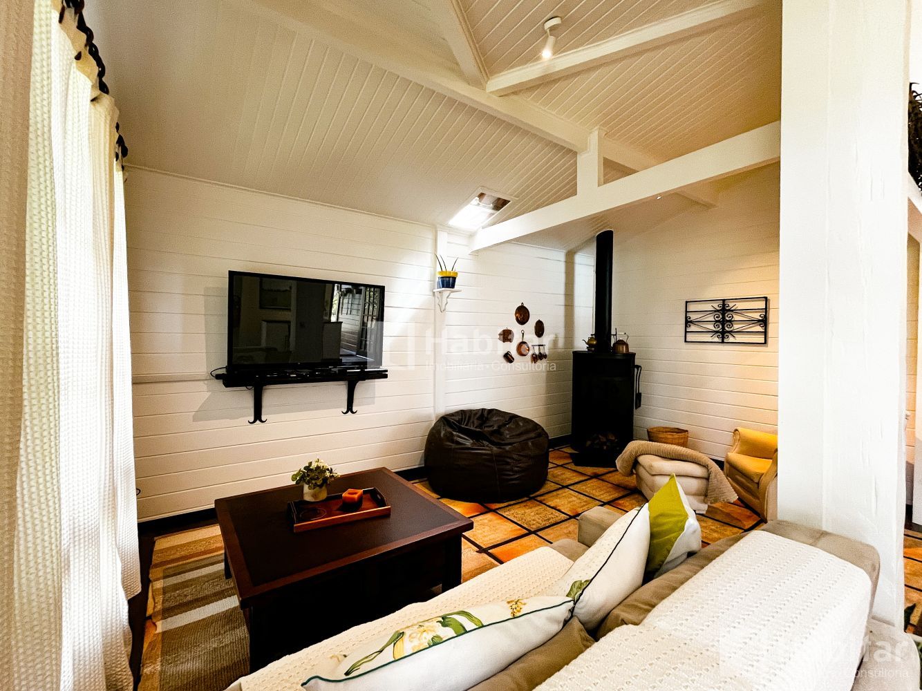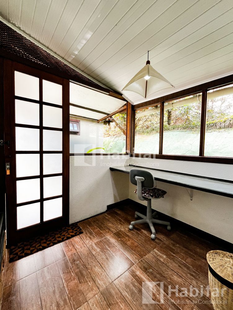 Sala com pé-direito alto, três ambientes; lareira; varanda;